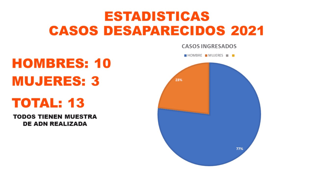 En el año 2021 se ingresaron 13 casos, de los cuales, 10 son hombres y 3 son mujeres; todos tienen su muestra de ADN realizada.