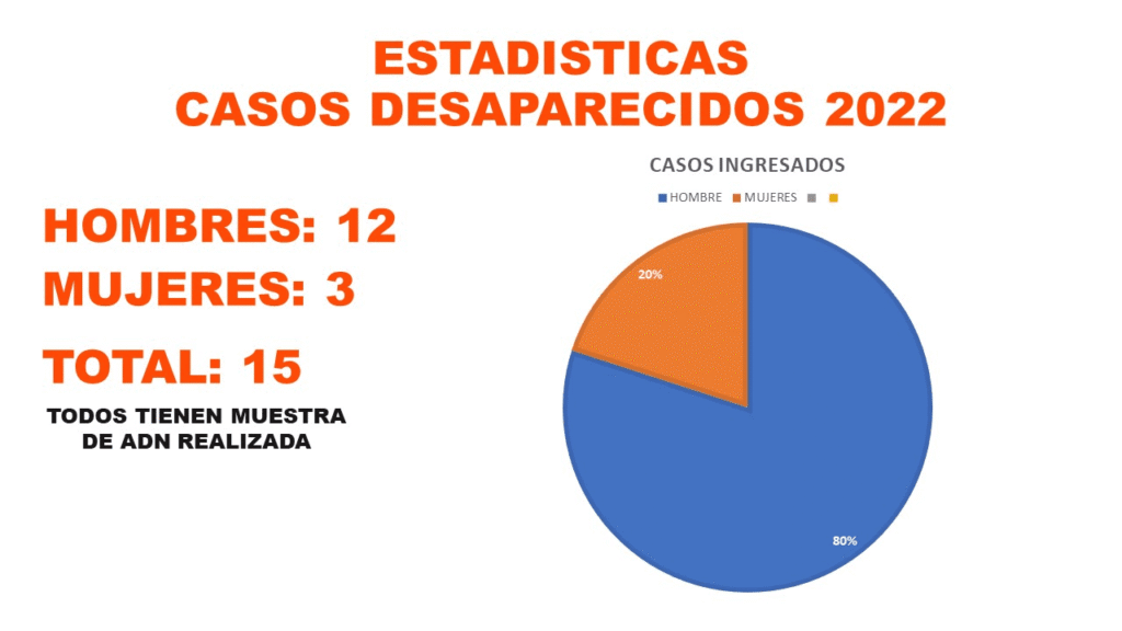 En el año 2022 se ingresaron 15 casos, de los cuales, 12 son hombres y 3 son mujeres; todos tienen su muestra de ADN realizada.