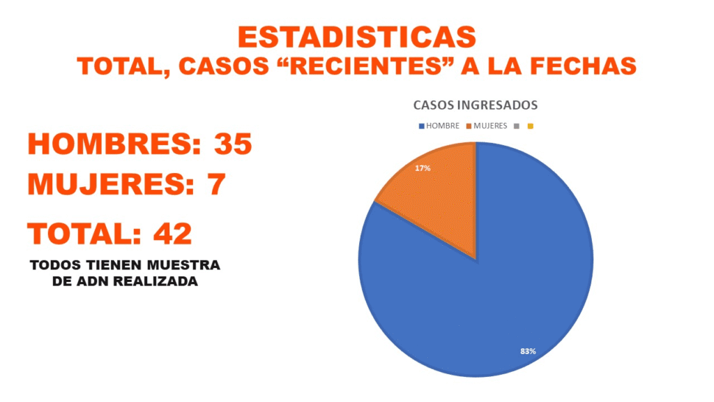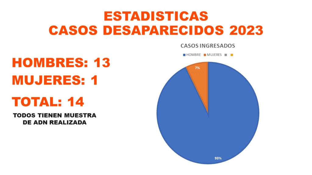 En el año 2023 se ingresaron 14 casos, de los cuales, 13 casos son hombre y 1 caso es mujer. A todos se le realizaron muestras de ADN en el mes de octubre del mismo año  2023.